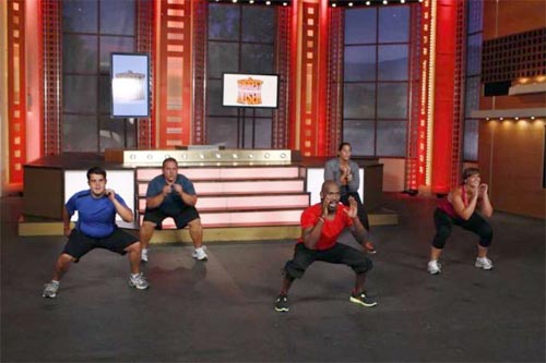 Then came Dolvett (shown above). He teaches a type of training called tabata, and I love it. It’s basically high-intensity interval training, where you do a move as hard and/or fast as you can for 20 seconds, then rest for 10 seconds. You repeat this cycle multiple times. Again, a lot of squats and lunges, but I was able to handle them fairly well. I love the idea of super intense bursts of energy, followed by recovery. I may have to try some non-Biggest Loser tabata workouts.